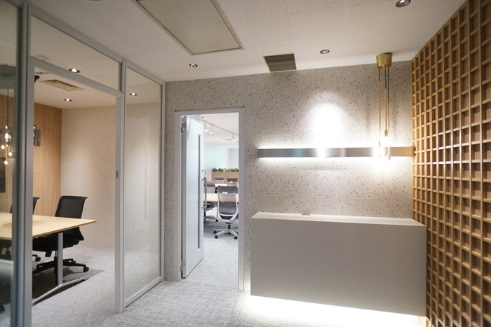 受付とその横にはモニター付きの会議室スペース