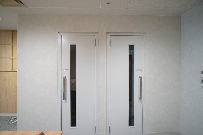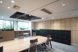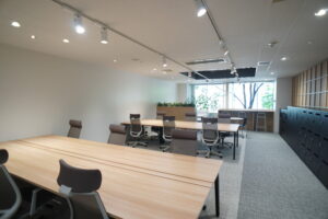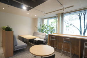 執務室にはWEB用のブースが2つ、窓際にはリフレッシュ、打ち合わせ等に使える多目的なスペースが設けられています。